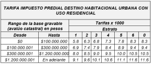 - Si el inmueble viene pagando el impuesto predial en años anteriores, tiene destinación habitacional urbano y un avalúo de $300.000.000, debes aplicar la tarifa que corresponda según el estrato socioeconómico y el rango de avalúo, teniendo en cuenta las tarifas explicadas más arriba.